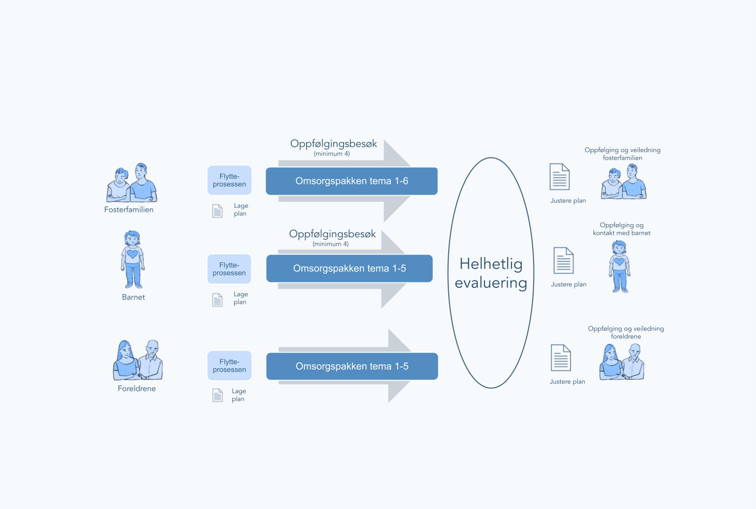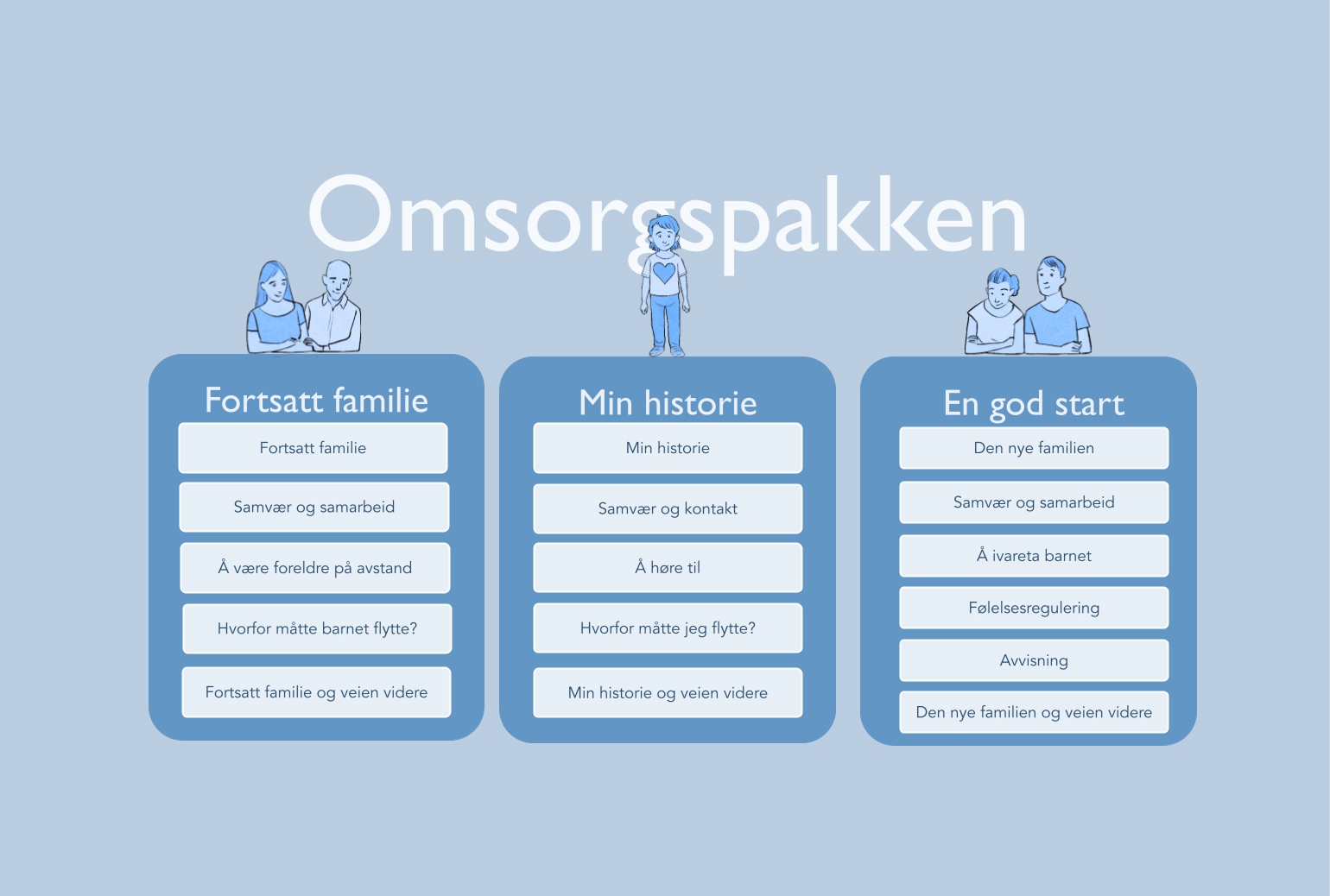 Her gir vi en kort beskrivelse av Omsorgspakken, med en mer inngående presentasjon av hvordan barnet, foreldrene og fosterfamilien kan følges opp. Gjennom Omsorgspakken ønsker vi å bidra til en mer systematisk og helhetlig oppfølging av barn som bor i fosterhjem.
